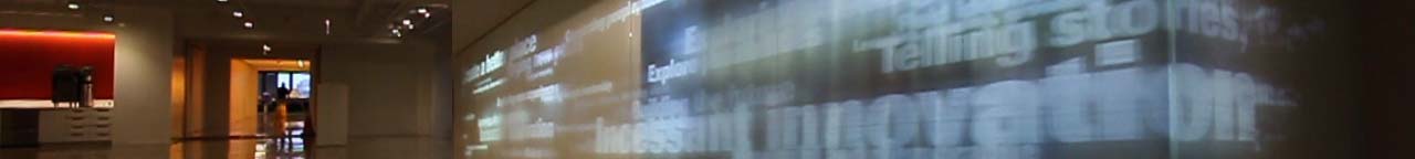 Five small video projectors mounted into the ceiling are used to create a single seemless ultra widescreen image that wraps around the corner. The installation was designed as a platform as well as an art-piece allowing the client the option of playing other specially formatted sequences as well.