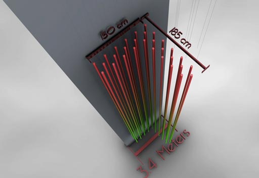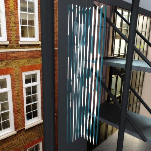 Located in the atrium of the newly refurbished Camden school, the DLT consists of 30 vertically suspended 9m light tubes. Each computer controlled light tube will illuminate saturated colour or play specially designed moving image sequences.